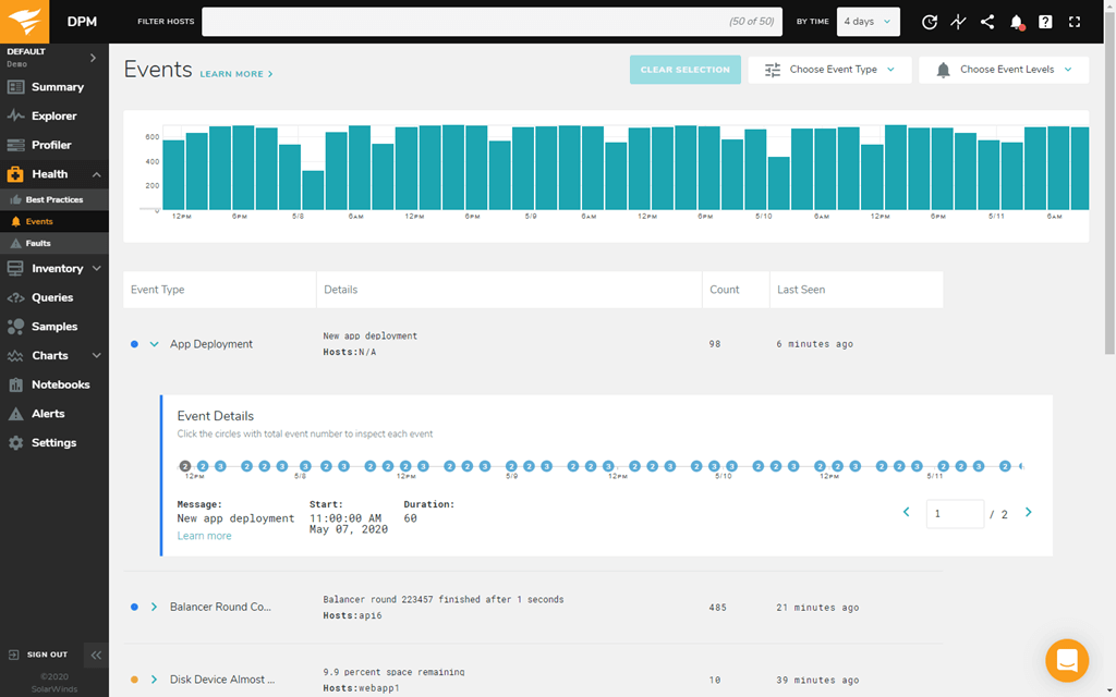 A combinação de eventos e alertas no DPM garantem que você fique a par de todas as anormalidades detectadas ou deduzidas no sistema, no host, nas consultas e mais.